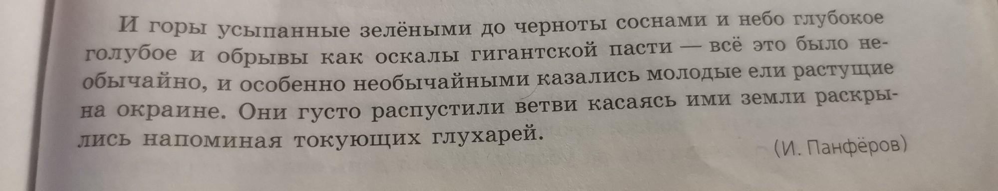 [И горы__ , /усыпанные зелёными до черноты соснами/~~, и небо__ , глубокое~~, голубое~~, и обрывы__ , /как оскалы гигантской пасти/_._._ , - всё__ это~~ было== необычайно== ] , и [особенно_._._ необычайными== казались== молодые ели__ , /растущие на окраине/~~].