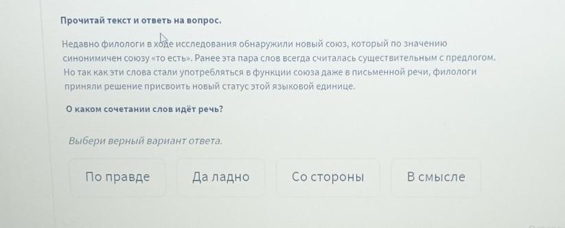 Прочитай текст и ответы на вопрос. Недавно филологи в хоҳе исследования обнаружили новый союз, который по значению xohe синонимичен союзу «то есть». Ранее эта пара слов всегда считалась существительным с предлогом. Но так как эти слова стали употребляться в функции союза даже в письменной речи, филологи приняли решение присвоить новый статус этой языковой единице. О каком сочетании слов идёт речь? Выбери верный вариант ответа. По правде Да ладно Со стороны В смысле