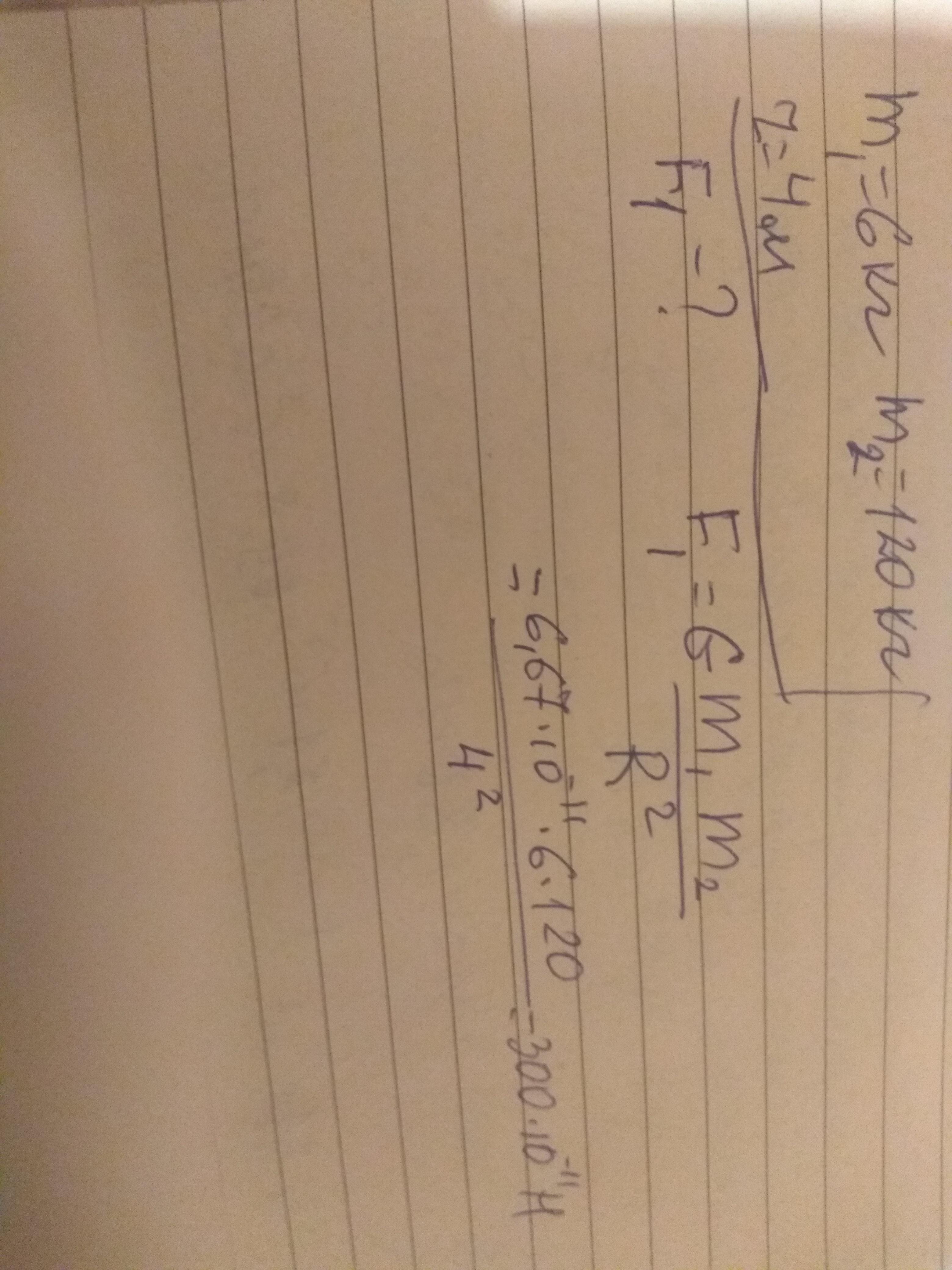F=G*m1*m2/r²=6,67·10⁻¹¹*6*120/4²=3*10⁻⁹Н