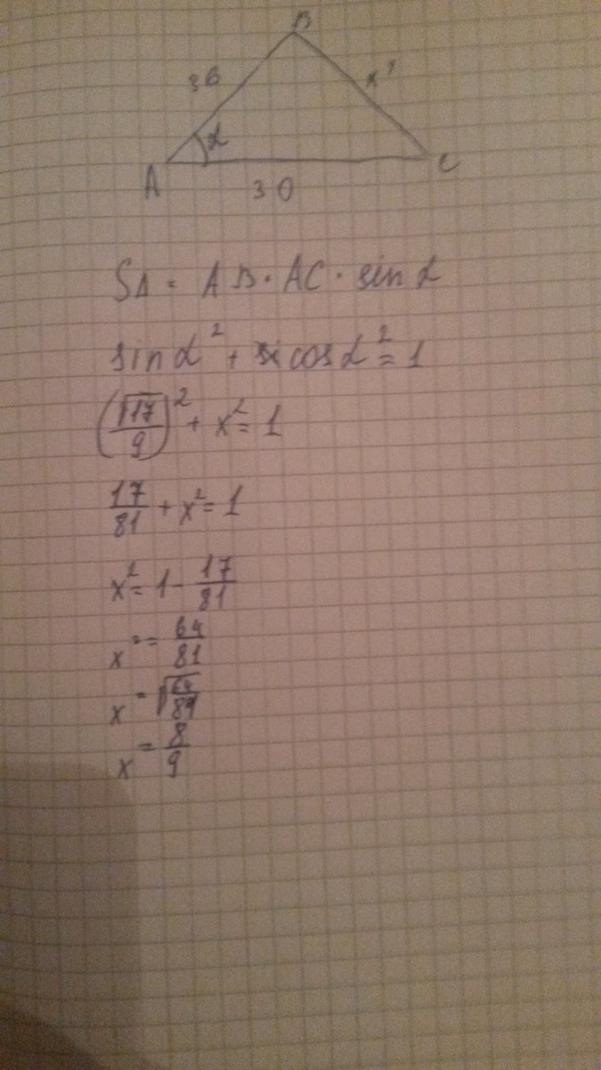 в треугольнике одна из сторон равна 36 другая равна 30 а косинус угла между ними равен квадратный корень из 17 поделенного на 9.найти площадь треугольника
