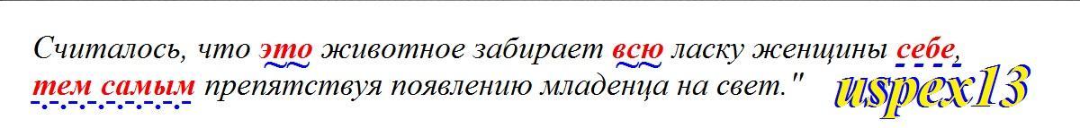 выпишите из предложения: Считалось, что это животное забирает всю ласку женщины себе, тем самым препятствуя появлению младенца на свет." Подчеркните местоимения как члены предложения.