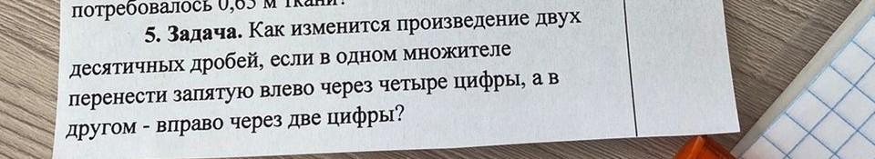 В задаче переместили запятую влево на 4 и вправо на 2, т.е. новое произведение от предыдущего будет отличаться смещением запятой влево на 2 цифры.