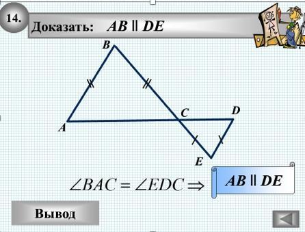 ⇒ АВ || DE по 1 признаку (накрест лежащие углы равны)