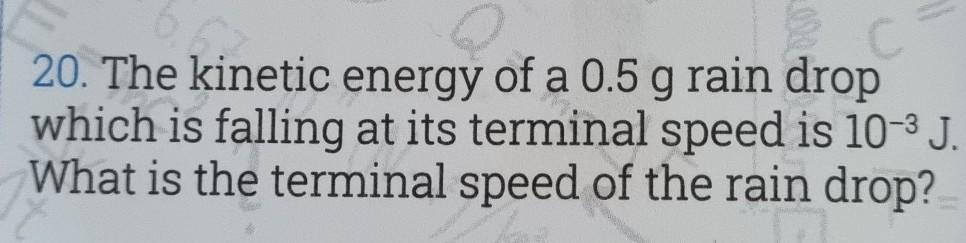 20. The kinetic energy of a 0.5 g rain drop which is falling at its terminal speed is 10-3 J. What is the terminal speed of the rain drop?