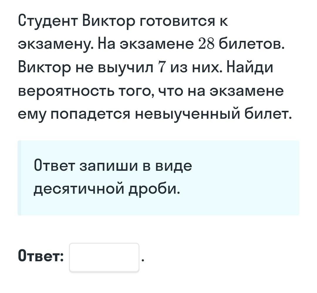 7/28=0,25 Если что , вероятность того что он вытащит выученный 0,75