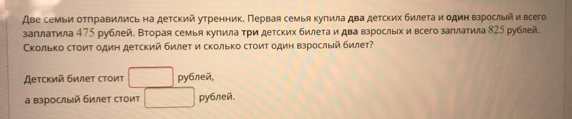 y = 475-2*125 = 475-250 = 225(руб) - стоимость взрослого билета