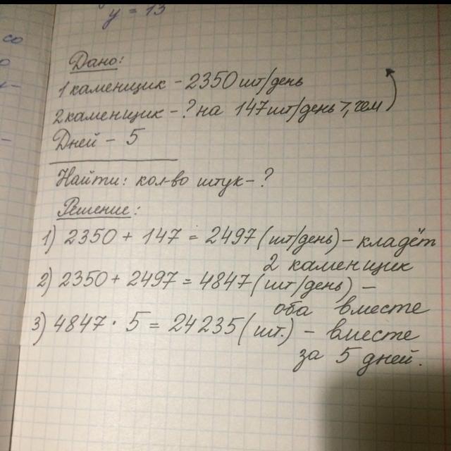 один каменщик уложил 2350 кирпичей, а другой-на 147 кирпичей больше. Сколько кирпичей эти каменщики могут уложить вдвоём за 5 дней, укладывая в день такое же количество кирпичей? Мне нужна СХЕМА для задачи