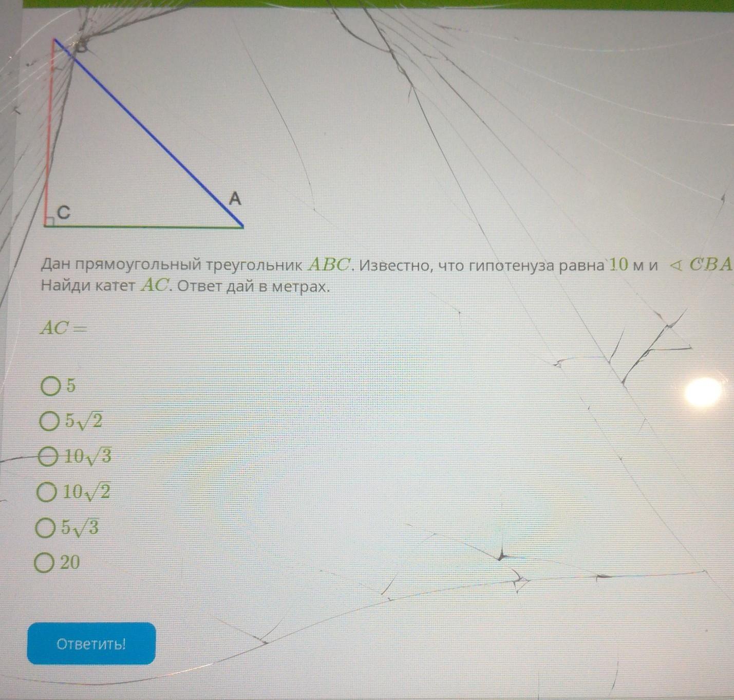 Дан прямоугольный треугольник ABC известно что гипотенуза равна 10 м и косинус CBA равен 30° Найдите катет АС