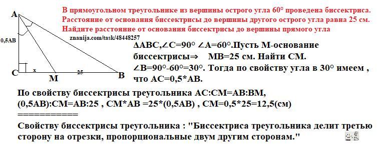 в прямоугольном треугольнике из вершины острого угла 60° проведена биссектриса. Расстояние от основания биссектрисы до вершины другого острого угла равна 25 см. Найдите расстояние от основания биссектрисы до вершины прямого угла
