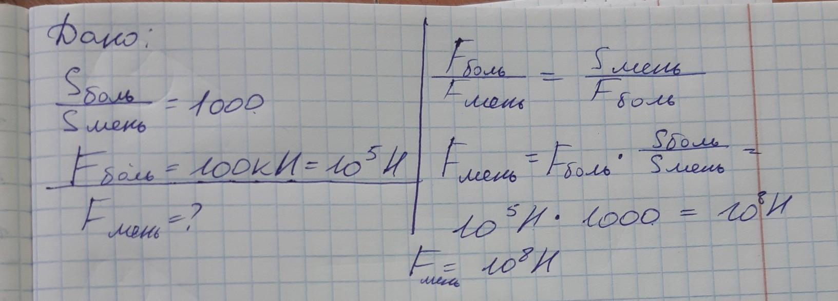 464. Площадь большого поршня пресса в 1000 раз боль- ше площади малого. Какая сила действует на малый пор- шень, если сила давления, производимого большим порш- нем, составляет 100 кН?
