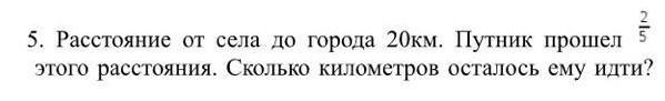 Растояние села до города 20км.Путние прошёл 2/5 этого растояния. Сколько километров осталось ему идти отдаю всё плиз