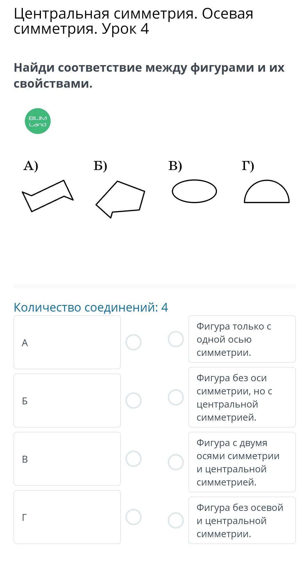 Центральная симметрия. Осевая симметрия. Урок 4 Найди соответствие между фигурами и их свойствами.  Количество соединений: 4 А Б В Г Фигура только с одной осью симметрии. Фигура без оси симметрии, но с центральной симметрией. Фигура с двумя осями симметрии и центральной симметрией. Фигура без осевой и центральной симметрии. Назад Проверить