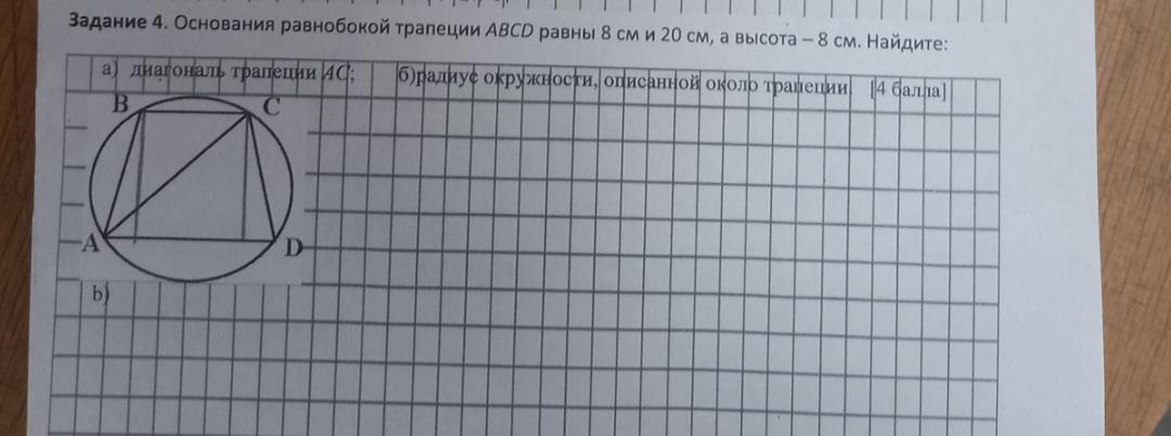 Основание равнобокой трапеции ABCD равны 8 см и 20 см, а высота - 8 см. Найдите: а)диагональ трапеции АС