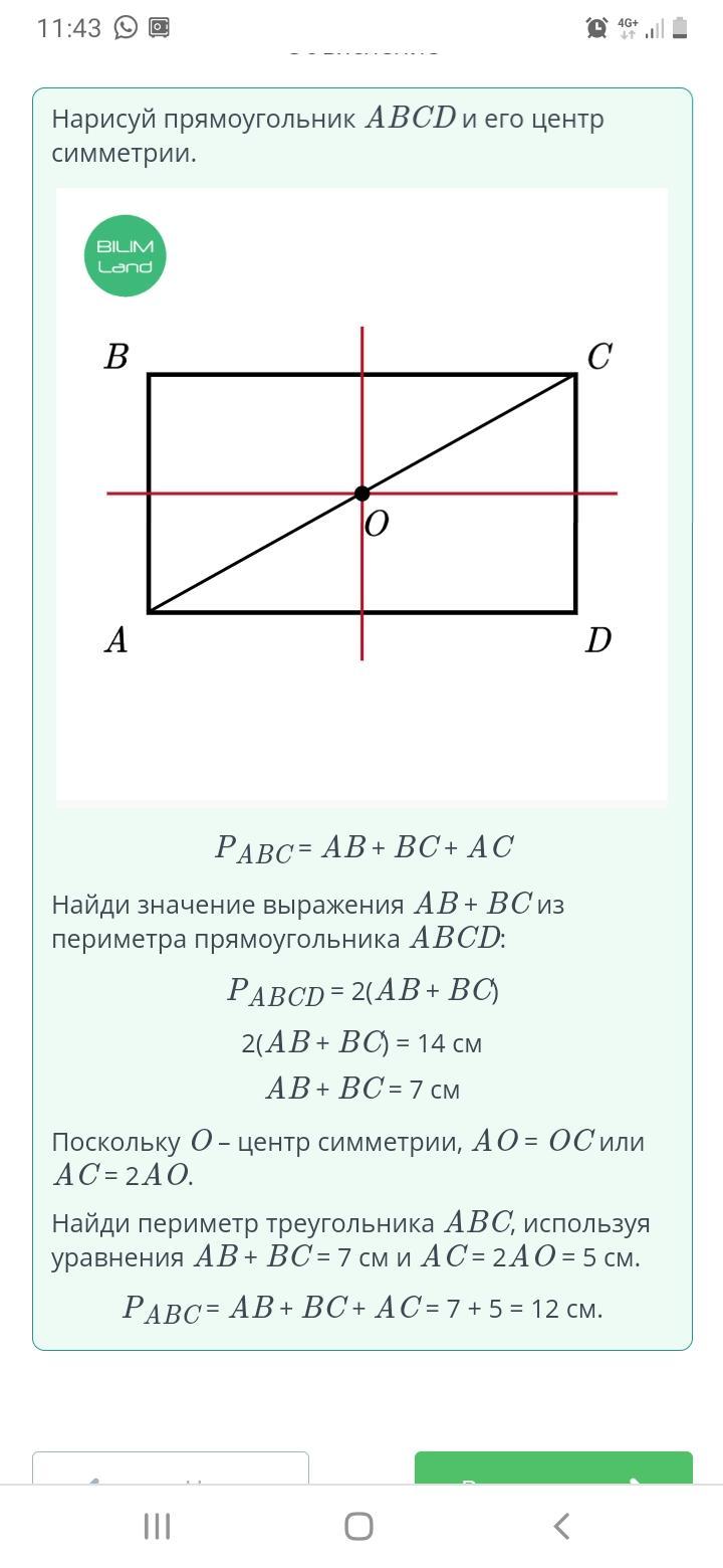 Центральная симметрия. Осевая симметрия. Урок 4 Периметр прямоугольника ABCD равен 14 см. Расстояние от вершины A до центра симметрии O равно 2,5 см. Найди периметр треугольника ABC. Ответ: см.