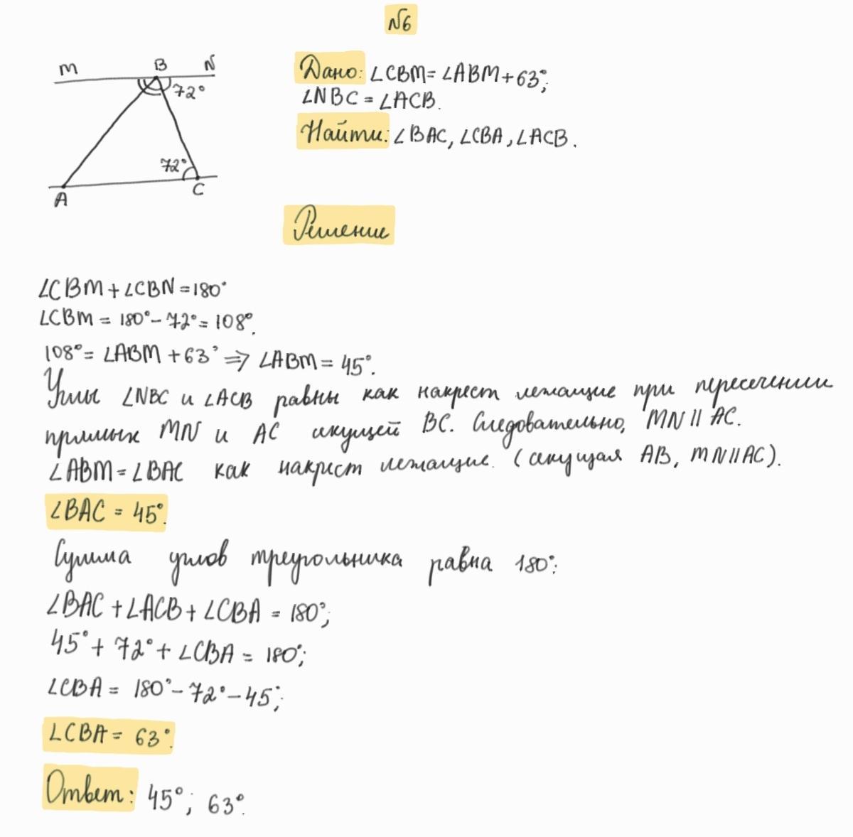 6. На рисунке дано угол CMA больше угла ABM на 63° . Найдите углы треугольника ABC. Помогите пожалуйста! Я не понимаю