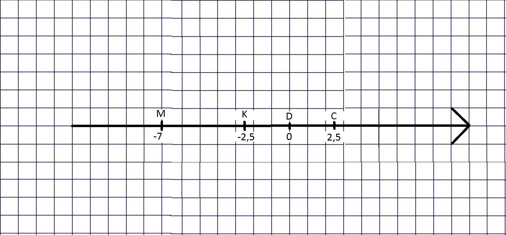 отметьте на координатной прямой точки M(-7),K(-2,5),D(5),C(2,5).Какие из отмеченных точек имеют противоположные координаты?Назовите какую-нибудь точку с координатой больше, чем -2,5
