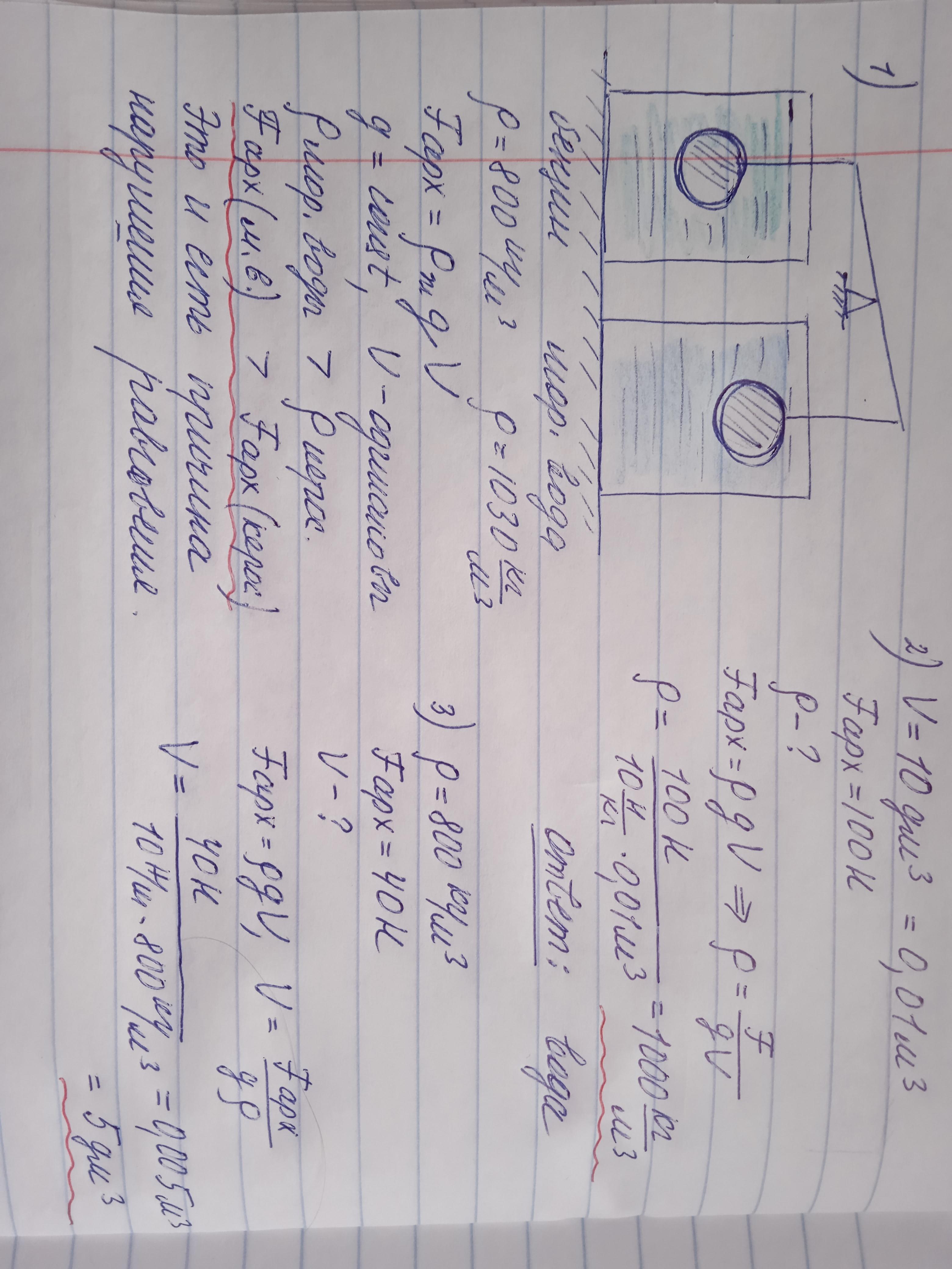 №1: Подвешенные к рычажным весам одинаковые шарики погрузили один в ёмкость с бензином, другой в ёмкость с морской водой. Нарушится ли равновесие вссов? Почему? Сделать рисунок. №2: На тело объемом 10 дм* при полном погружении в жидкость действует выталкивающая сила 100 Н Какая это жидкость? №3: Определите объём плиты, полностью погруженной в керосин, если на неё действует выталкивающая сила 40 Н. №4: Какая требуется сила, чтобы удержать под водой пробковый пояс массой 2 кг. объем которого 10 дм3.