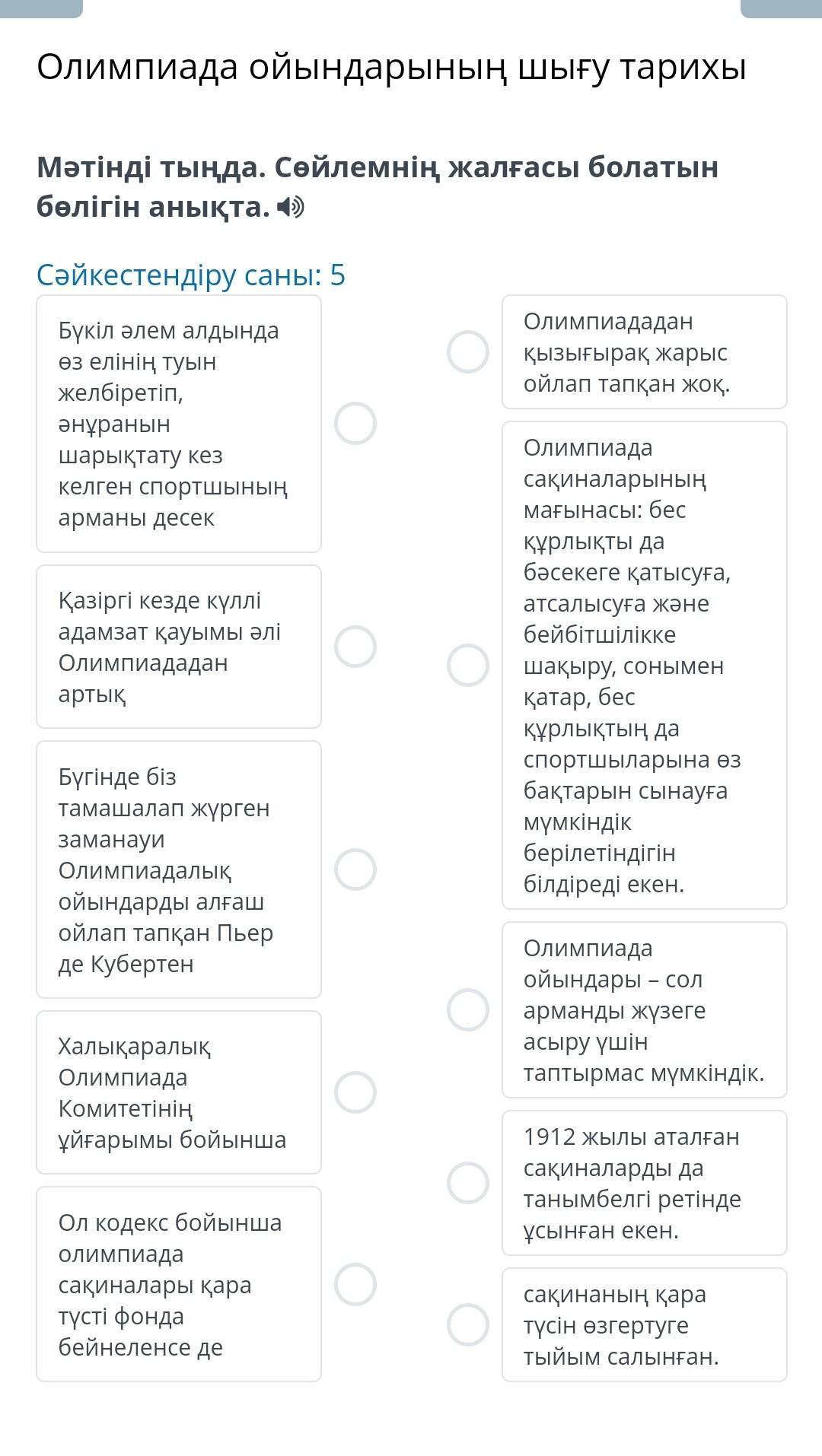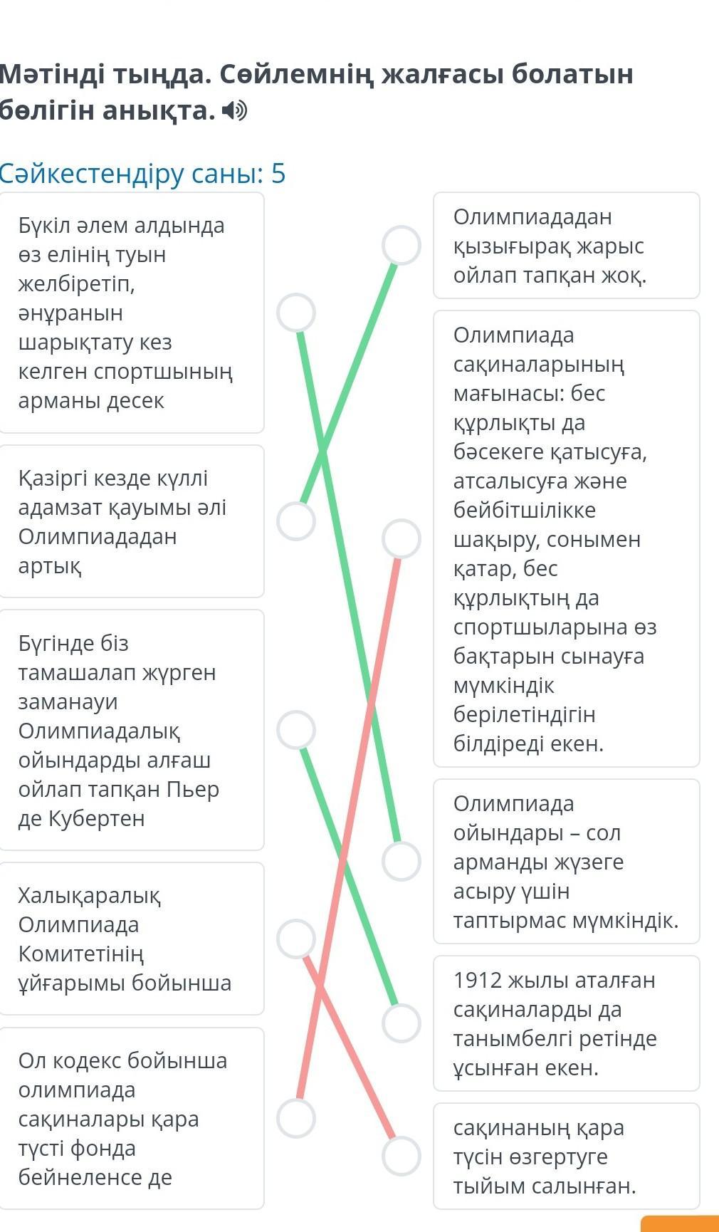 Олимпиада ойындарының шығу тарихы Мәтінді тыңда. Сөйлемнің жалғасы болатын бөлігін анықта. Сәйкестендіру саны: 5 Бүкіл әлем алдында өз елінің туын желбіретіп, әнұранын шарықтату кез келген спортшының арманы десек Қазіргі кезде күллі адамзат қауымы әлі Олимпиададан артық Бүгінде біз тамашалап жүрген заманауи Олимпиадалық ойындарды алғаш ойлап тапқан Пьер де Кубертен Халықаралық Олимпиада Комитетінің ұйғарымы бойынша Ол кодекс бойынша олимпиада сақиналары қара түсті фонда бейнеленсе де Олимпиададан қызығырақ жарыс ойлап тапқан жоқ. Олимпиада сақиналарының мағынасы: бес құрлықты да бәсекеге қатысуға, атсалысуға және бейбітшілікке шақыру, сонымен қатар, бес құрлықтың да спортшыларына өз бақтарын сынауға мүмкіндік берілетіндігін білдіреді екен. Олимпиада ойындары – сол арманды жүзеге асыру үшін таптырмас мүмкіндік. 1912 жылы аталған сақиналарды да танымбелгі ретінде ұсынған екен. сақинаның қара түсін өзгертуге тыйым салынған. Артқа Тексеру