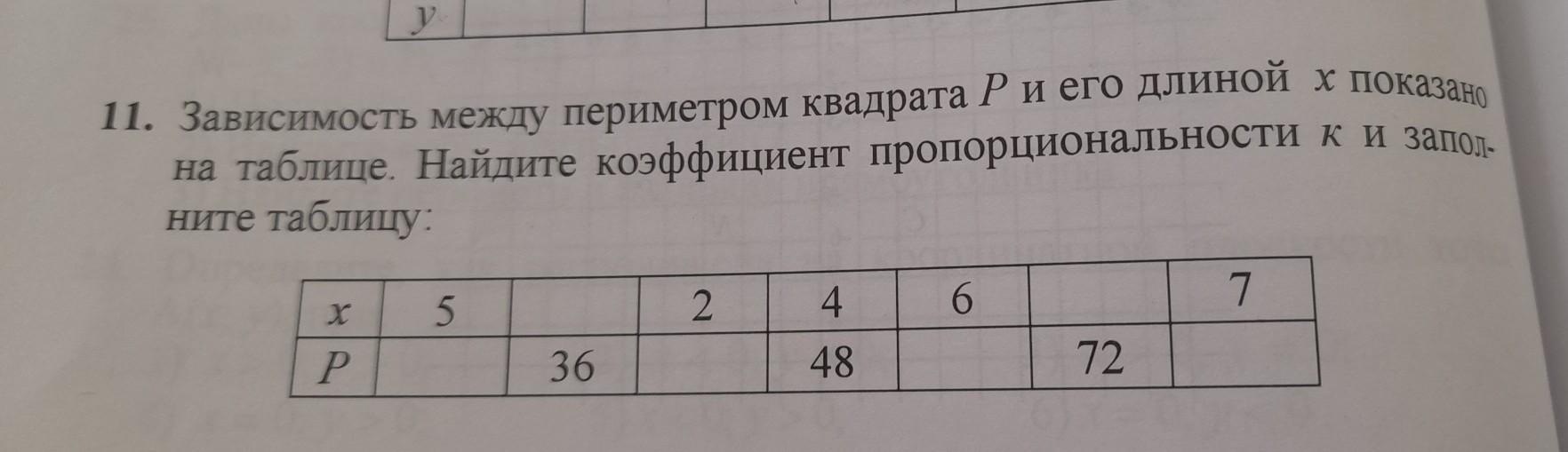 11. Зависимость между периметром квадрата P и его длиной x показано на таблице. Найдите коэффициент пропорциональности ки запол- ните таблицу: х 5 2 4 6 7. P. 36 48 72