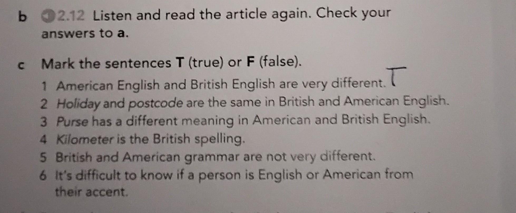 b 2.12 Listen and read the article again. Check your answers to a. с Mark the sentences T (true) or F (false). 1 American English and British English are very different. I 2 Holiday and postcode are the same in British and American English, 3 Purse has a different meaning in American and British English. 4 Kilometer is the British spelling. 5 British and American grammar are not very different. 6 It's difficult to know if a person is English or American from their accent.