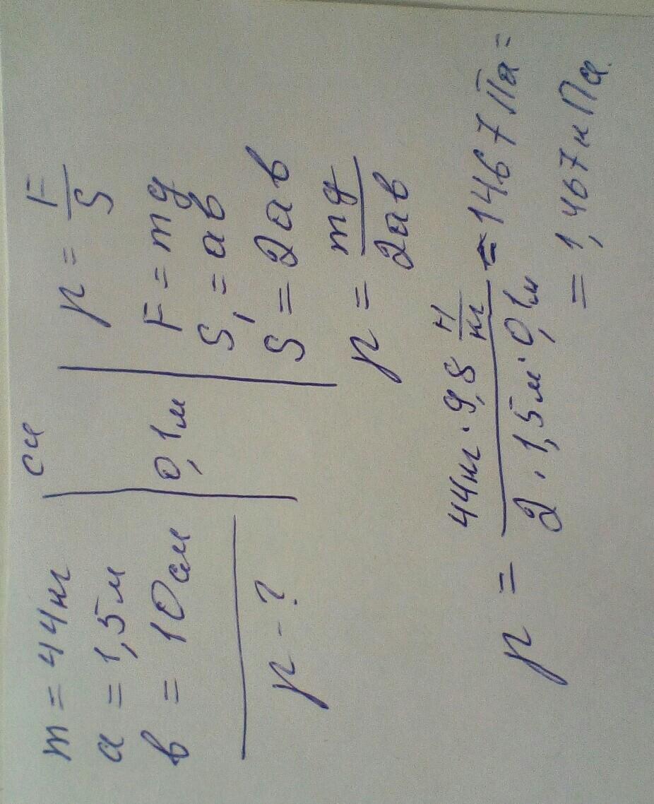 Мальчик массой 44 кг стоит на лыжах. Длина каждой лыжи равна 1,5 м, ширина равна 10 см.