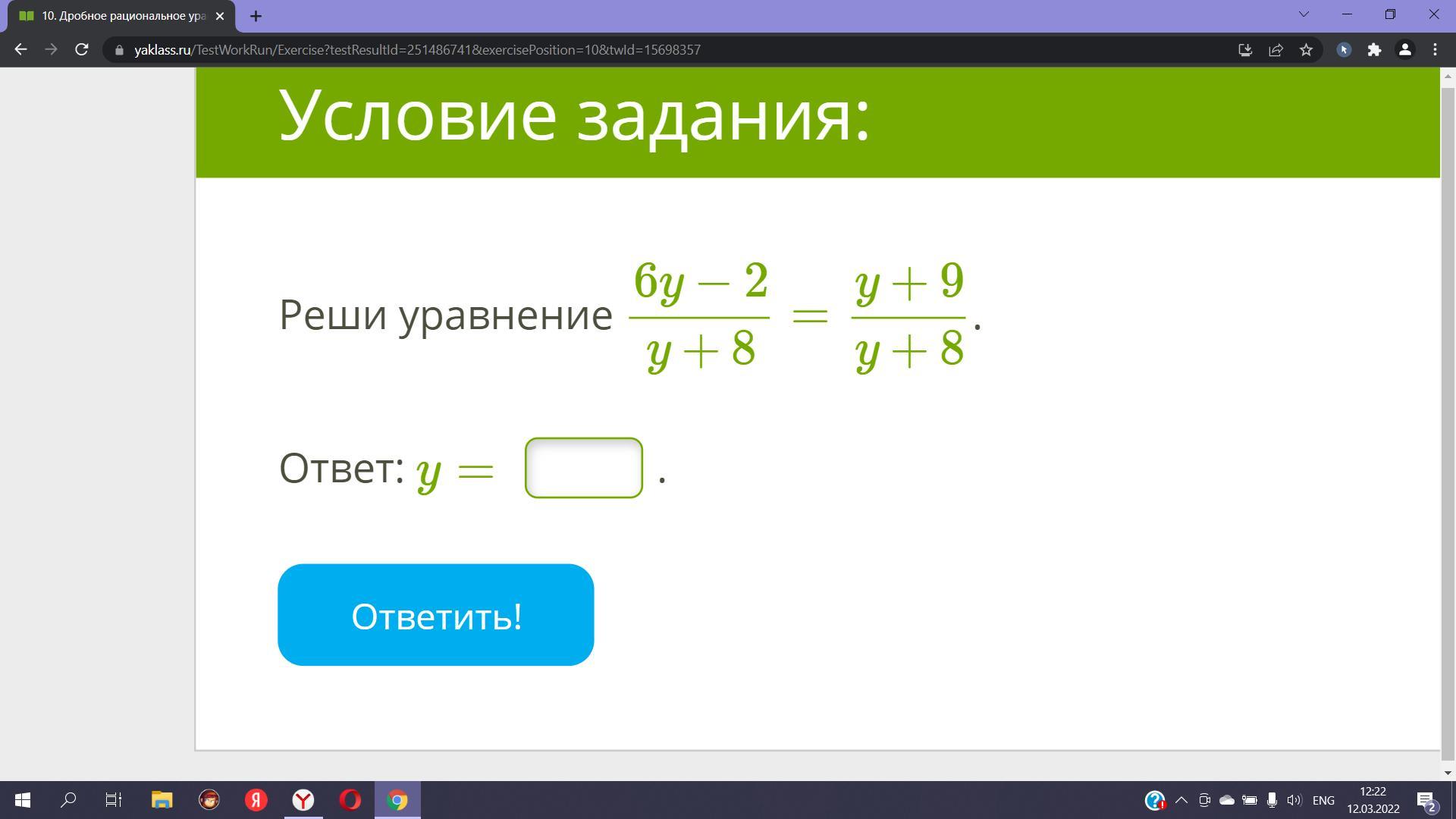 сначала обе части умножить на у+8 чтобы избавиться от знаменателя, а потом как обычное уравнение