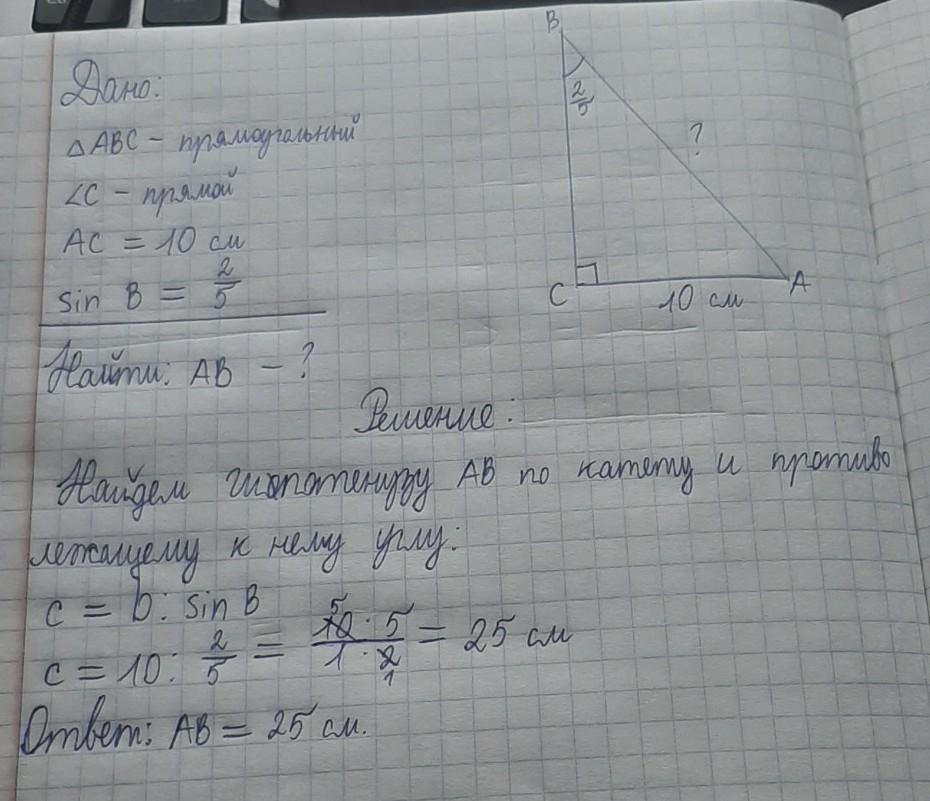 в прямоугольном треугольнике авс с прямым углом с катет ас равен 10 см,а синус угла В равен 2/5.найдите гипотенузу прямоугольного треугольника.