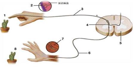 в)Прикосновение к кактусу создает болевое ощущение и вызывает одергивание руки. Это происходит благодаря сгибательному рефлексу. При этом болевые сигналы попадают в спинной мозг и передаются вставочным нейронам, а они возбуждают исполнительные нейроны, посылающие команду к мышцам руки.