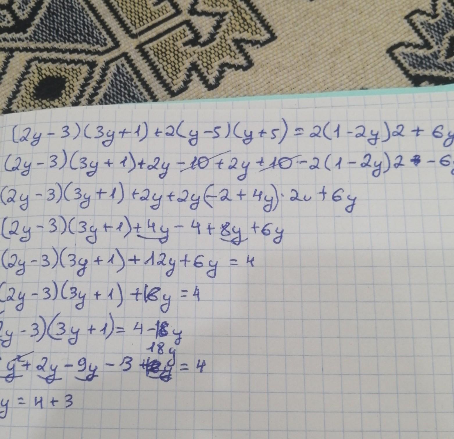 1) (2y - 3)(3y + 1) + 2(y - 5)(y + 5) = 2(1-2y)2 + 6y;
