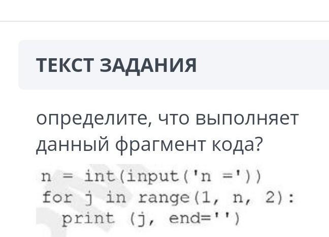 Выводит все нечётные числа от 1-го до n не включительно, в одну строку, без пробелов.