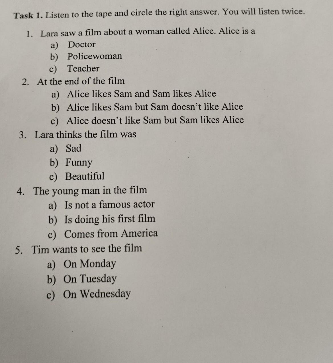 Listening Task 1. Listen to the tape and circle the right answer. You will listen twice. 1. Lara saw a film about a woman called Alice. Alice is a a) Doctor b) Policewoman c) Teacher 2. At the end of the film a) Alice likes Sam and Sam likes Alice b) Alice likes Sam but Sam doesn't like Alice c) Alice doesn't like Sam but Sam likes Alice 3. Lara thinks the film was a) Sad b) Funny c) Beautiful 4. The young man in the film a) Is not a famous actor b) Is doing his first film c) Comes from America 5. Tim wants to see the film a) On Monday b) On Tuesday c) On Wednesday HO