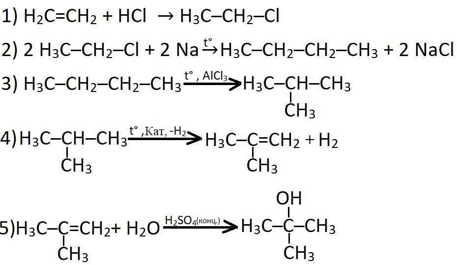 C2H4----HCL----→x1----t,Na----→x2-----t, alcl3---→x3 -----t, kat, -h2----→x4 -----h2o, h2so4(конц)---→х5