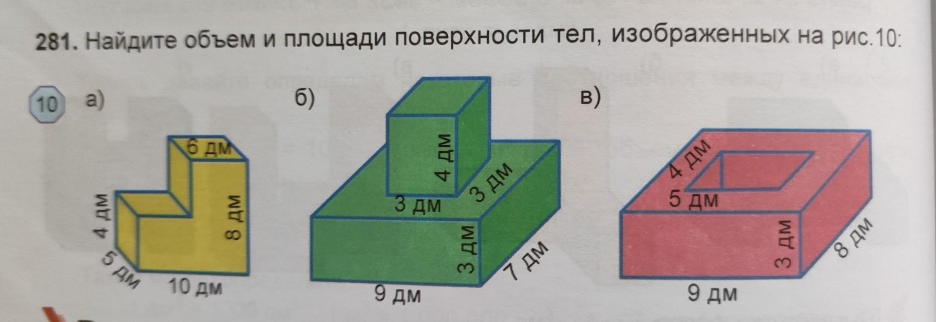 281. Найдите объем и площади поверхности тел, изображенных на рис. 10: 10 а) б) B) 6 дм 4 дм 4 дм Здм 3 дм 4 дм 8 дм 5 дм 5 дм 3 дм 3 дм 8 дм 10 дм 7 дм 9 дм 9 дм