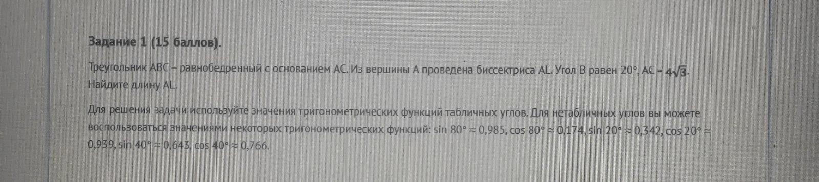 Для решения задачи используйте значения тригонометрических функций табличных углов. Для нетабличных углов вы можете воспользоваться значениями некоторых тригонометрических функций: sin 80° ≈ 0,985, cos 80° ≈ 0,174, sin 20° ≈ 0,342, cos 20° ≈ 0,939, sin 40° ≈ 0,643, cos 40° ≈ 0,766.
