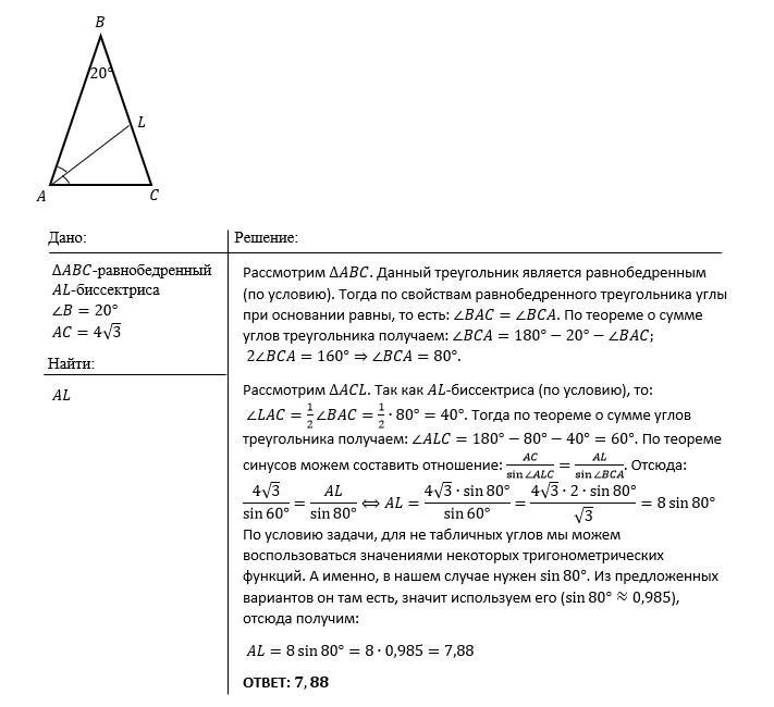 Треугольник ABC – равнобедренный с основанием AC. Из вершины A проведена биссектриса AL. Угол B равен 20°, AC =