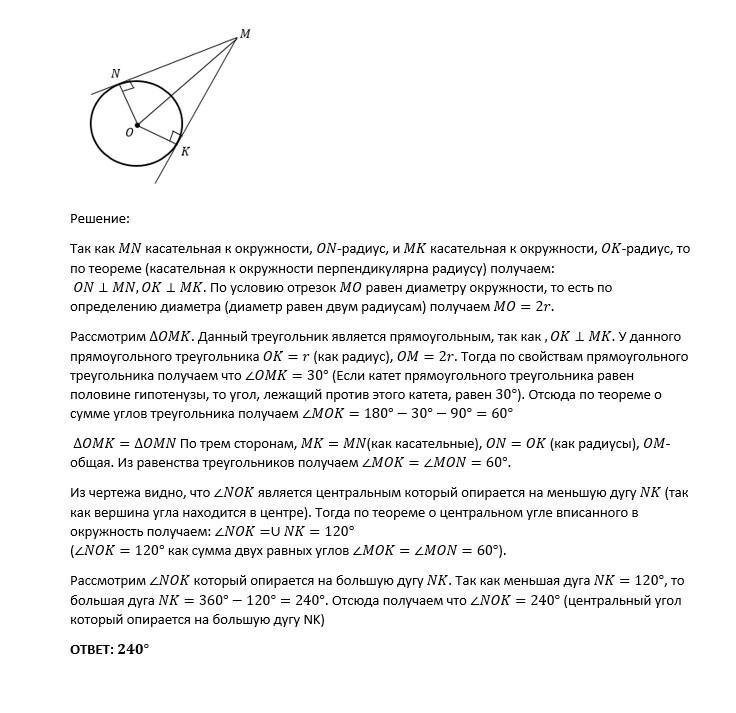 Дана окружность с центром в точке O. Из точки M к данной окружности проведены касательные MN и MK (K и N – точки касания). Определите градусную меру центрального угла, опирающегося на большую дугу KN, если известно, что длина отрезка MO равна диаметру данной окружности.