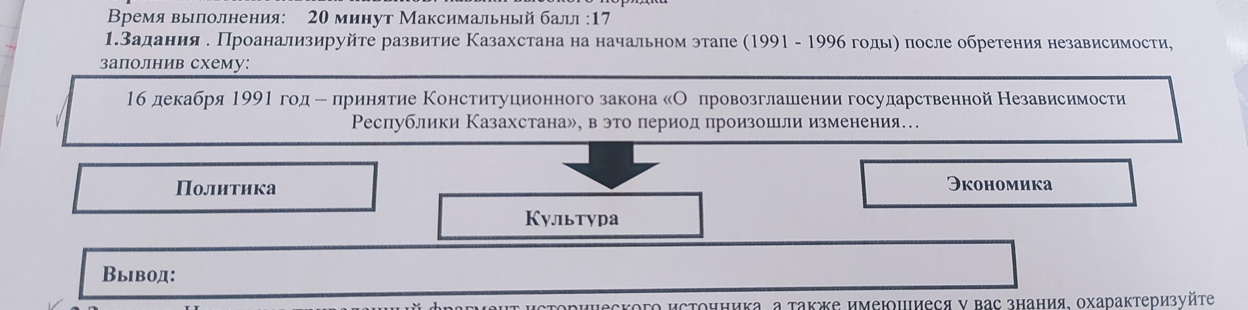Отдаю все баллы. Проанализируйте развитие Казахстана на начальном этапе (1991 - 1996 годы) после обретения независимости, заполнив схему: