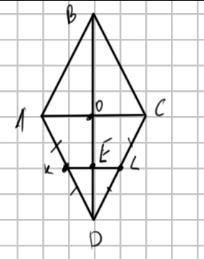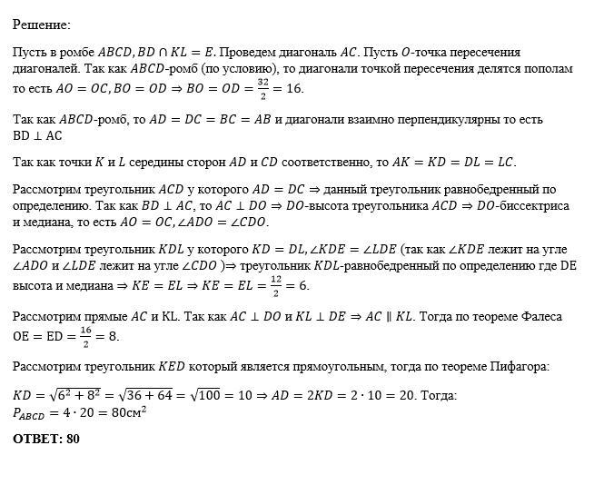 Дан ромб ABCD. На сторонах AD и CD отмечены точки K и L – середины сторон AD и CD соответственно. Длина отрезка KL равна 12 см. Длина диагонали BD равна 32 см. Найдите периметр данного ромба.