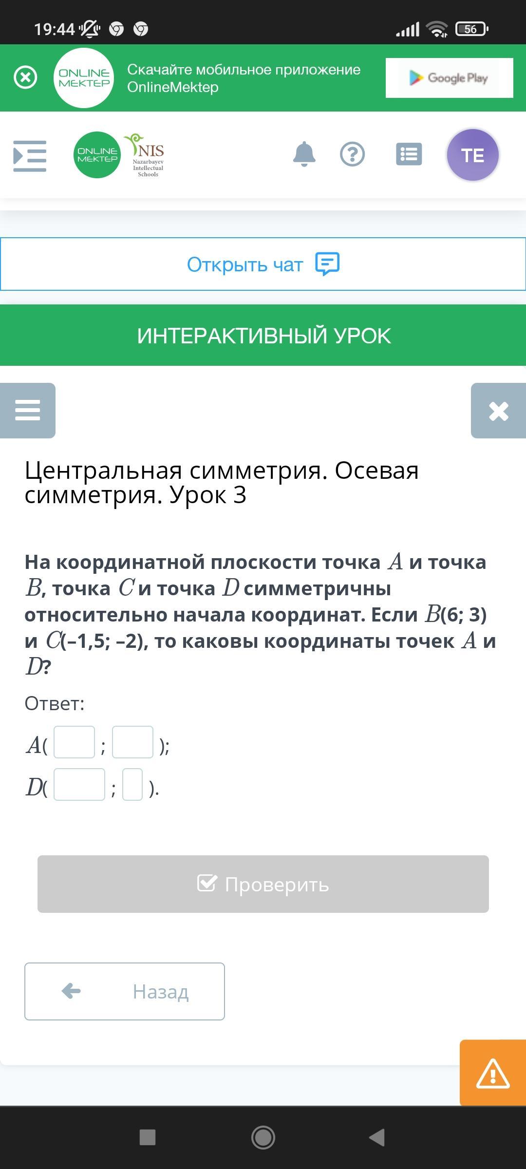 Помогите пж онлайн мектеп На координатной плоскости точка A и точка B, точка C и точка D симметричны относительно начала координат. Если B(6; 3) и C(–1,5; –2), то каковы координаты точек A и D?