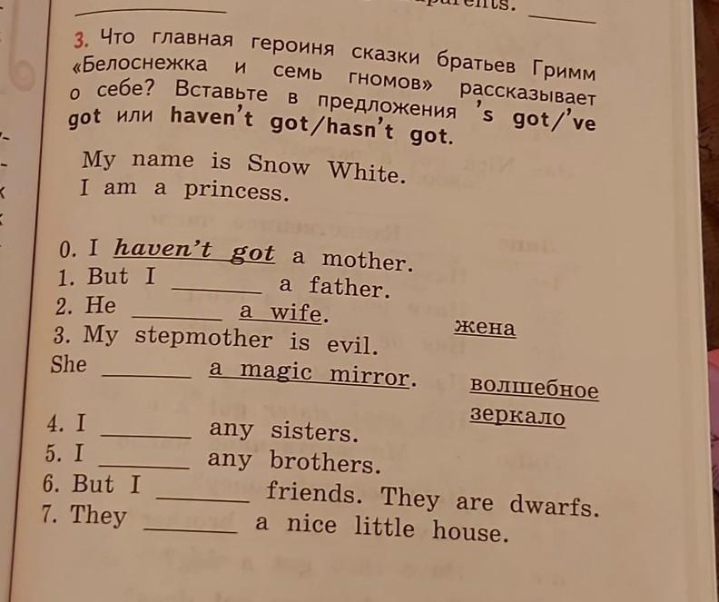 3. Что главная героиня сказки братьев Гримм "Белоснежный и семь гномов» рассказывает о себе? Вставьте в предложения