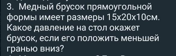 Дано:а=0,15мb=0,2мс=0,1мρ=8900кг/м³р-?Решение:V=abc=0,15*0,2*0,1=0,003м³m=Vρ=0,003*8900=26,7кгР=mg=26,7*10=267HS=aс=0,1*0,15=0,015м²p=P/S=267/0,015=17800Па