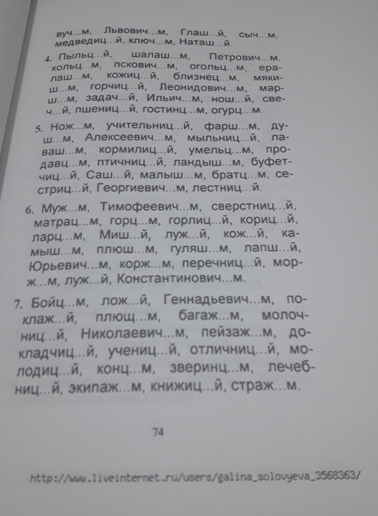 4.Пыльцой,шалашом,Петровичем,кольцом,псковичем,огольцом,ералашем,кожицей,близнецом,мякишем,горчицей,Леонидовичем,маршем,задачей,Ильичом,ношей,свечей,пшеницей,гостиницей,огурцом