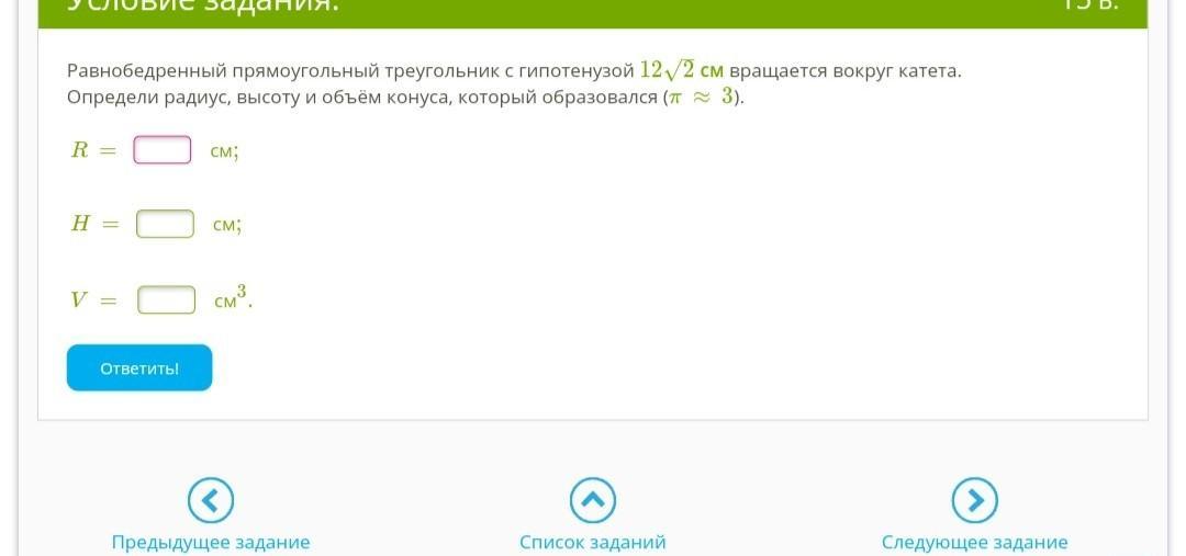 1) катеты треугольника будут равни и будут высотой и радиусом. за теоремой Пифагора находим эти катеты: