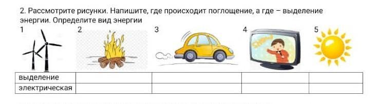 . Рассмотрите рисунки. Напишите, где происходит поглощение, а где – выделение энергии. Определите вид энергии электрическая