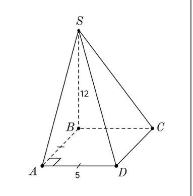 SB ⊥ (ABC); DС ⊥ ВС, т.к. ВС⊥DС, т.к. АВСD квадрат, ВС- проекция SC на (АВС), тогда по теореме о трех перпендикулярах и наклонная SC⊥DC, значит, надо найти SC, чтобы найти площадь грани SCD, т.к. ее площадь равна SC*DС/2; из треугольника SCB гипотенуза SC=√(SB²+BC²)=√(12²+5²)=√169=13, SC*DС/2=13*25/2=162.5