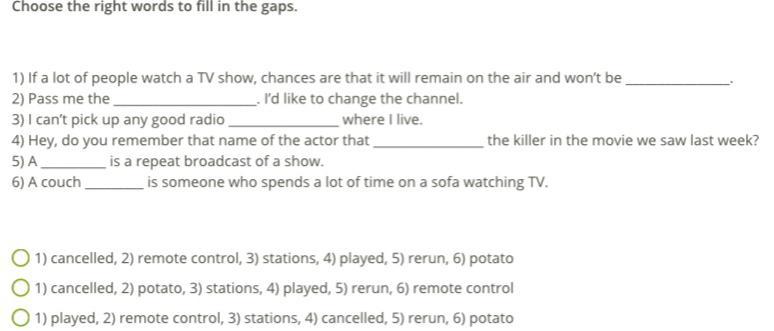 1) played, 2) remote control, 3) stations, 4) cancelled, 5) rerun, 6) potato
