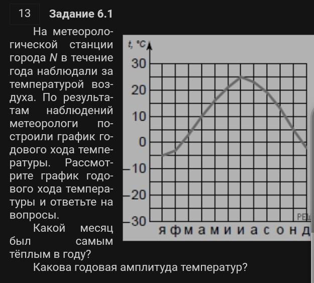2) Какова годовая....? Годовая амплитуда температуры : средняя температура июля равна +25°C, а средняя температура января — -5°C. Амплитуда (А), будет равна 25-(-5). А=30