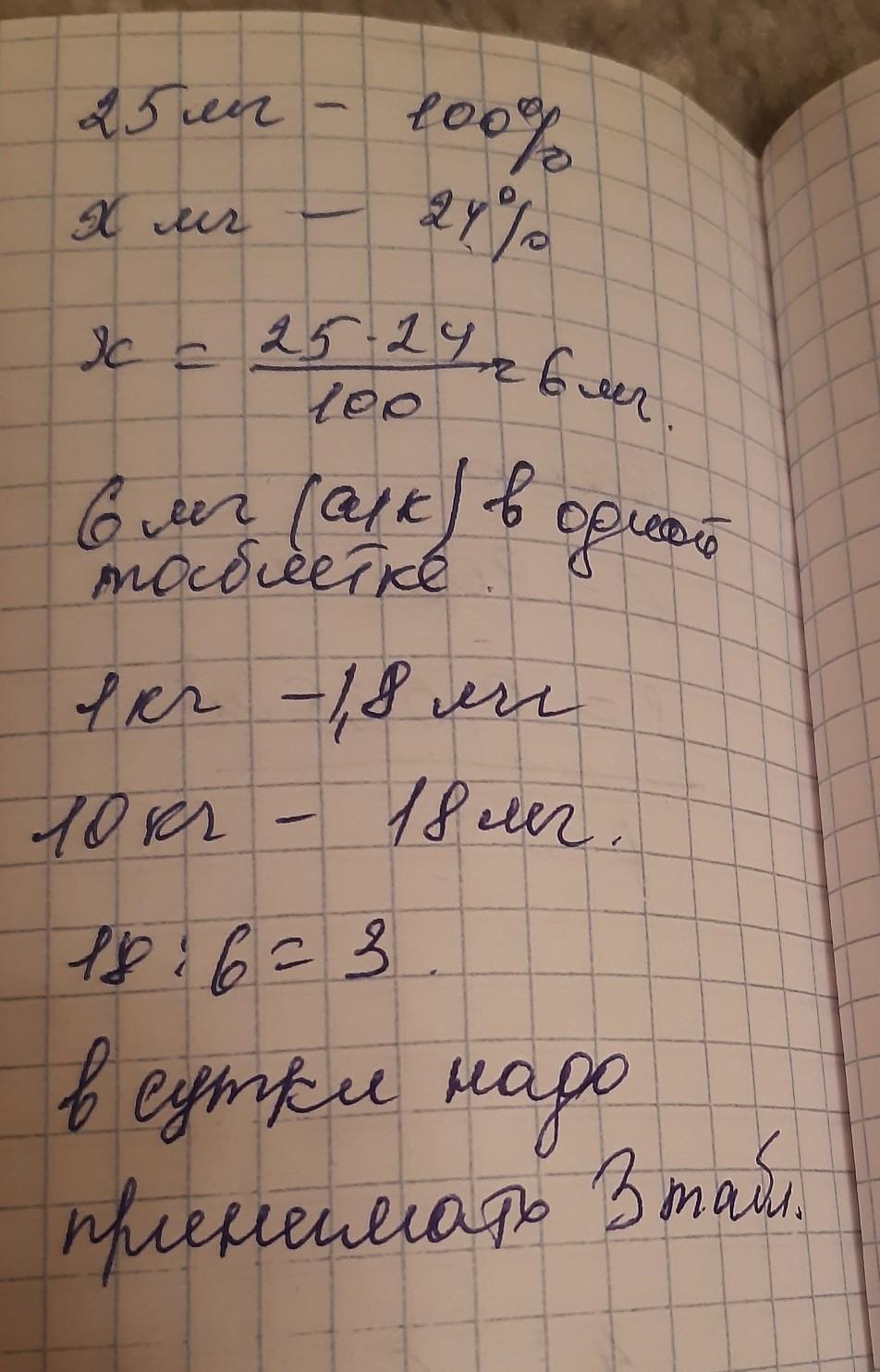 В таблетке массой 25 мг содержится 24% активного компонента. Врач выписал ребенку на каждый 1 кг его массы принимать 1,8 мг активного компонента в сутки в течение трех недель. Найдите, сколько таблеток в сутки необходимо давать ребенку, если его масса 10 кг