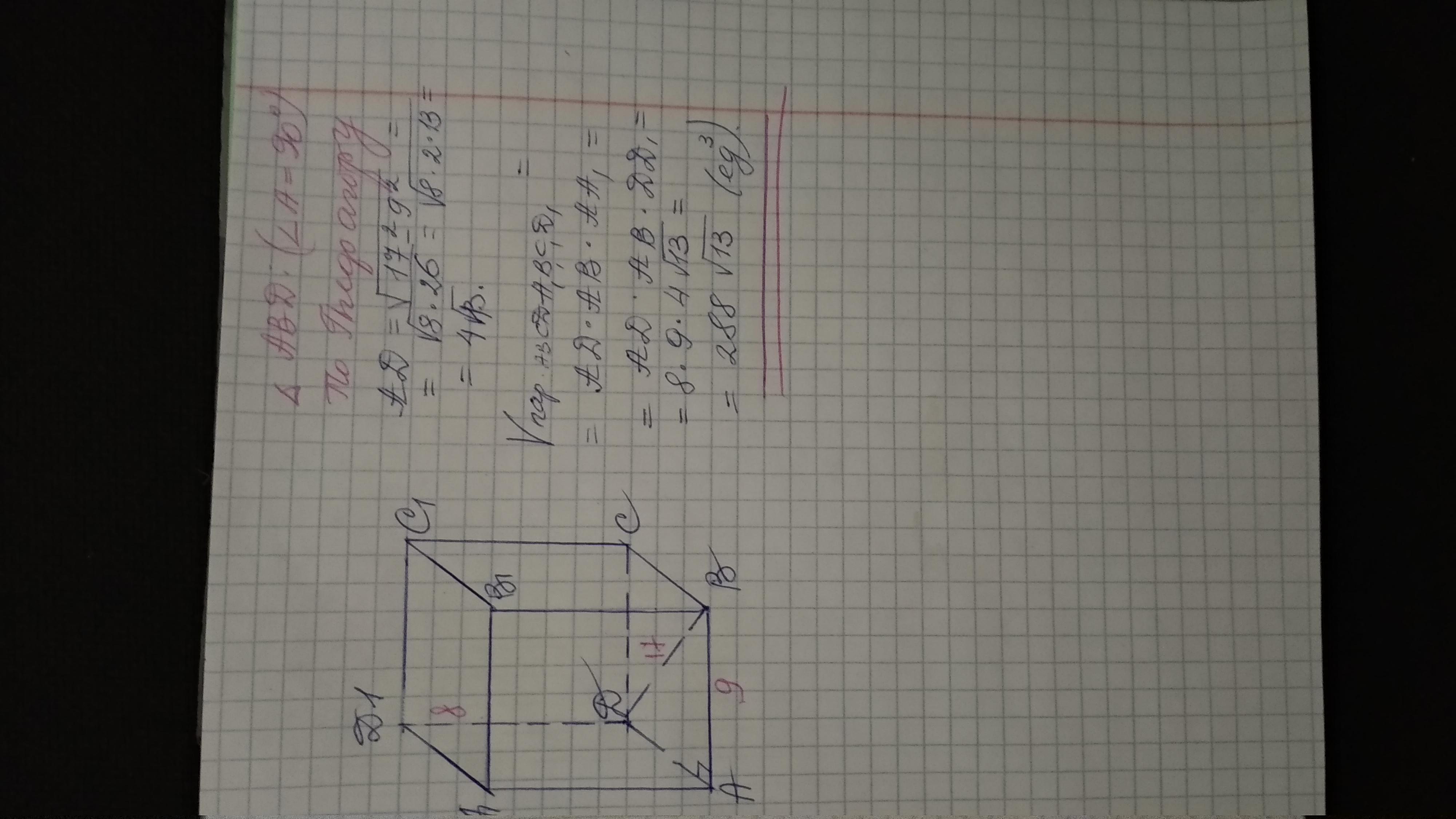 Дан прямоугольный параллелепипед ABCDA1B1C1D1, в котором BD = 17, DD1 = 8, AB = 9. Найдите его объём. МОЖНО С РИСУНКОМ ПОЖАЛУЙСТА!!