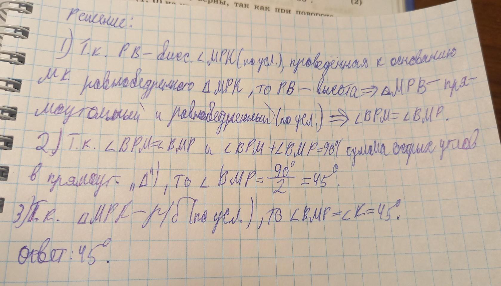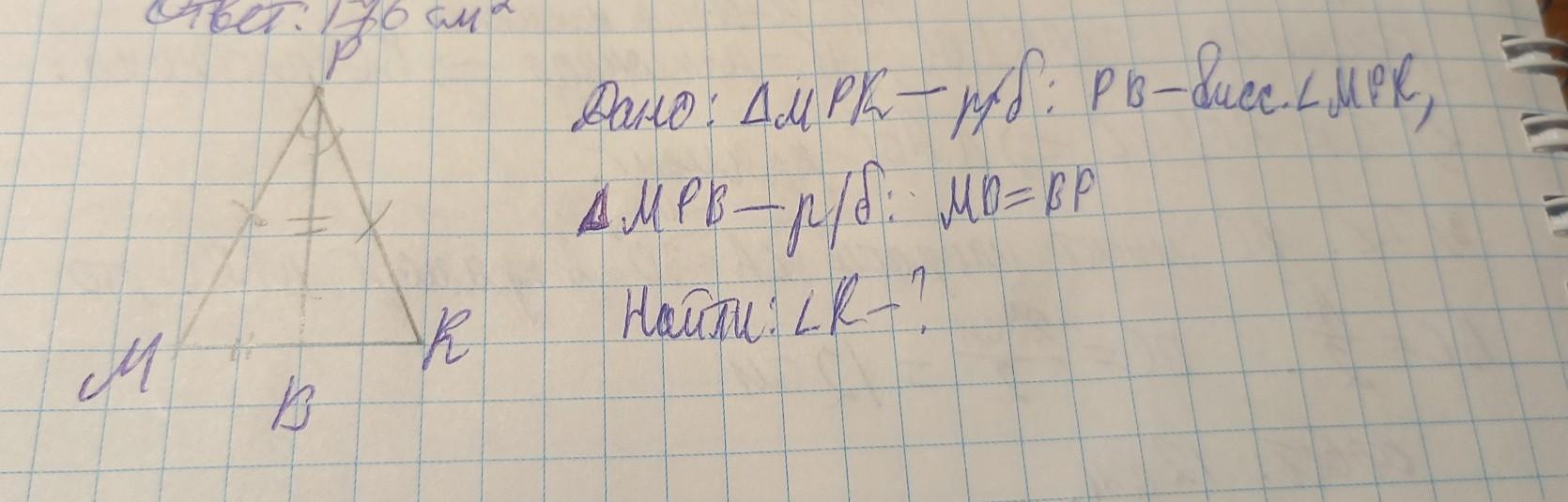 В равнобедренном треугольнике MPK с основанием MK провели биссектрису MB. Оказалось, что треугольник MPB - равнобедренный, причем MB=BP. Найдите угол K треугольника MPK.